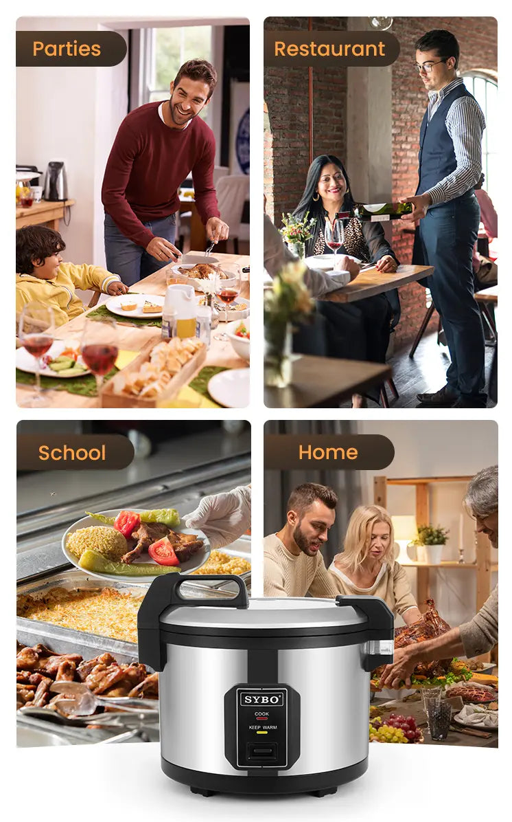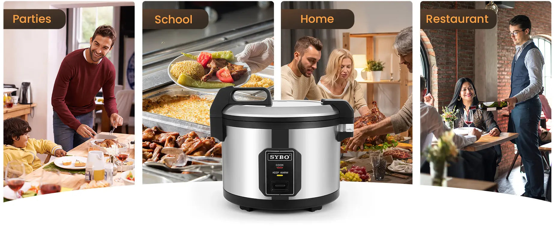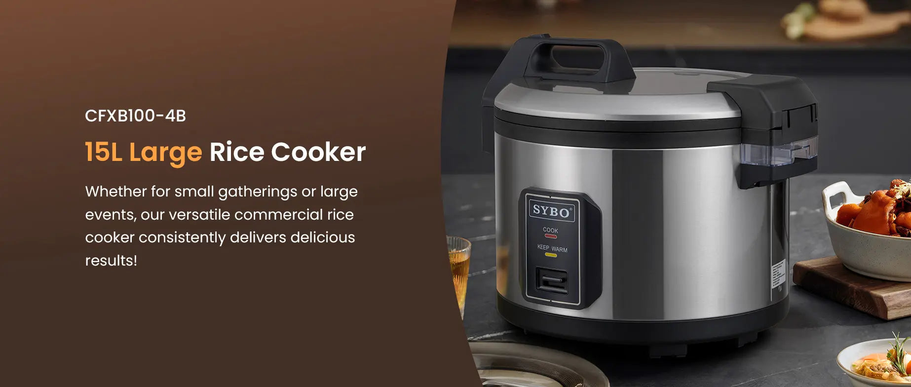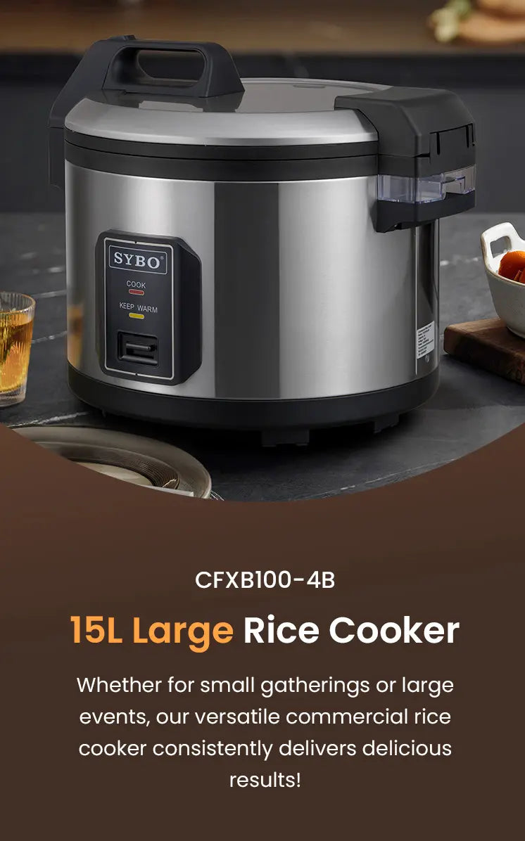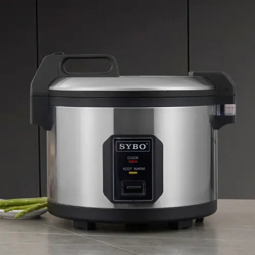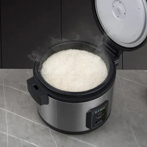 Sybo's commercial high-end rice cooker cooks up to 60 servings of rice to perfection and keeps it warm and steamy. The rice cooker comes with a 15 L inner nonstick pot and a measuring cup and spoon for perfect rice cooking measurements. Its smart-cover design clicks the lid into the closed position to ensure easy and safe handling while cooking rice.