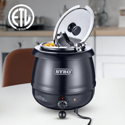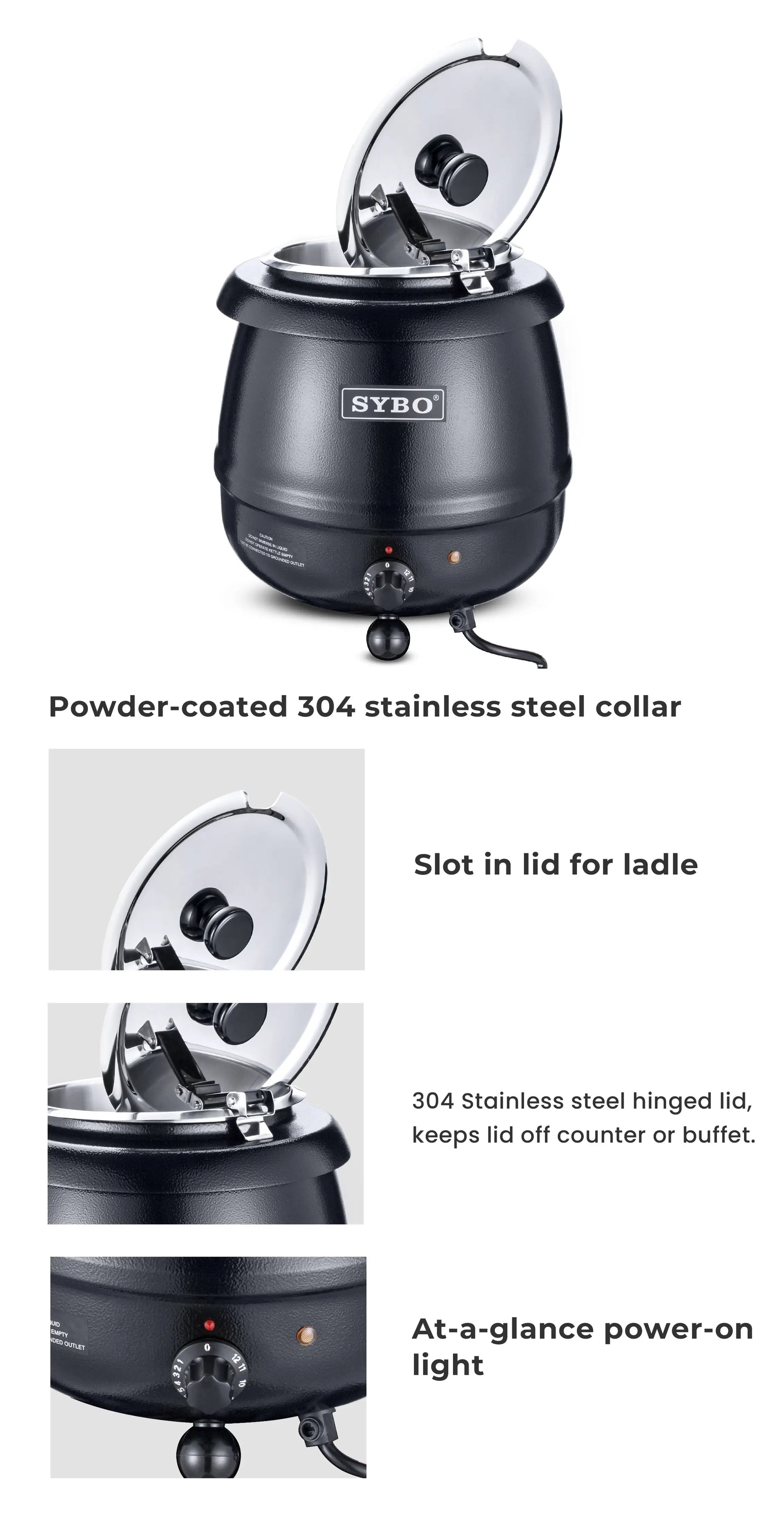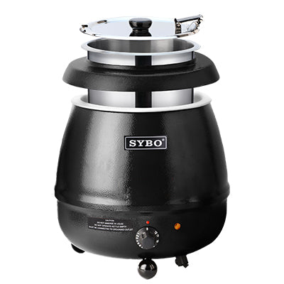 Serve fresh and hot delicious soups all day in SYBO’s large kettle style soup warmer. Designed to keep soups at safe serving temperatures for hours. 10.5 quart capacity for soup warming and holding. Adjustable heat control keeps soups at a safe serving temperature while preventing over cooking. Stainless steel hinged no-drip lid allows cover to be opened but not removed during service. Removable 18-10 stainless steel Bain Marie inner pot. Double wall construction keeps outer surface cooler to the touch.